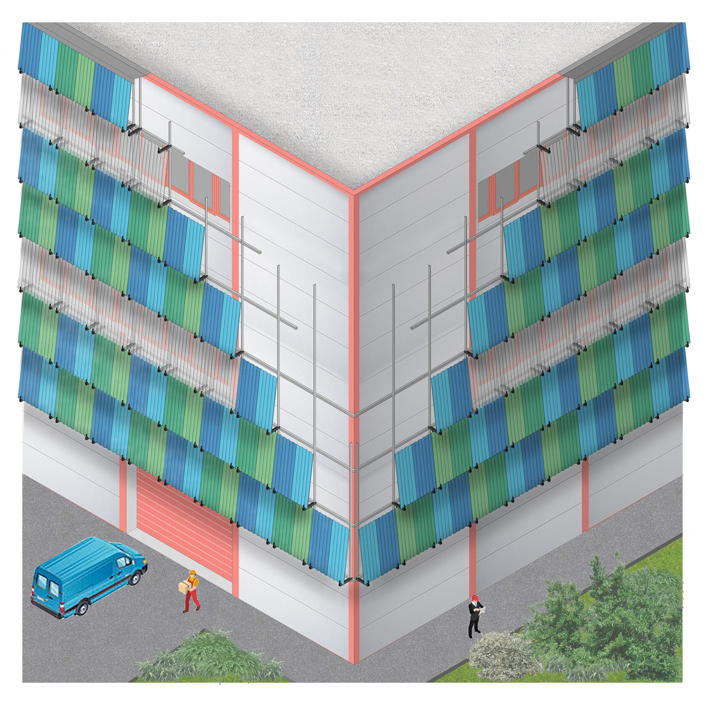 Il progetto è fortemente orientato alla sostenibilità e al riutilizzo: uno degli aspetti distintivi è il recupero dei materiali dai vecchi impianti, da demolire, per ridurre l’impatto ambientale e preservare la memoria storica del sito. Le lamiere degli impianti esistenti verranno smontate, riverniciate in loco con colori ispirati alla laguna e al logo di Enel Open Power Plant, e riutilizzate per rivestire parte dei nuovi edifici, contribuendo a dare nuova vita e identità visiva all’area, mantenendo un legame con il passato.