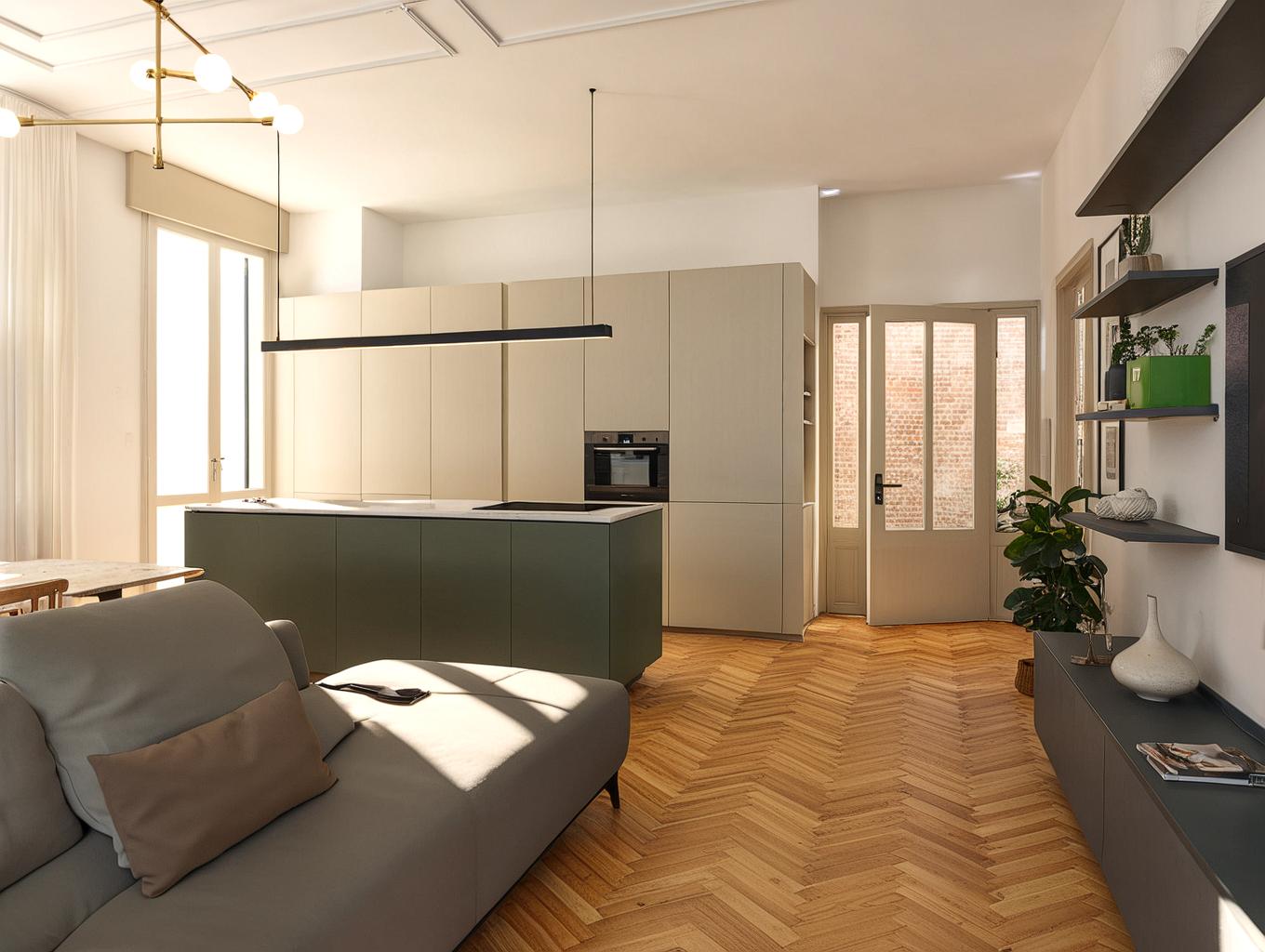 L’intero spazio giorno è stato concepito come un unico ambiente aperto che unisce cucina e soggiorno, favorendo un flusso continuo tra le due aree. La demolizione di alcune pareti interne ha ampliato la percezione degli spazi, migliorando la distribuzione della luce naturale. Le ampie finestre permettono alla luce di diffondersi attraverso l'appartamento, mettendo in risalto i dettagli storici, come le cornici decorative e gli stucchi originali, che sono stati restaurati e integrati con attenzione nel nuovo progetto. La luce esalta la bellezza di questi elementi, conferendo all’intero ambiente un’atmosfera vibrante e raffinata.