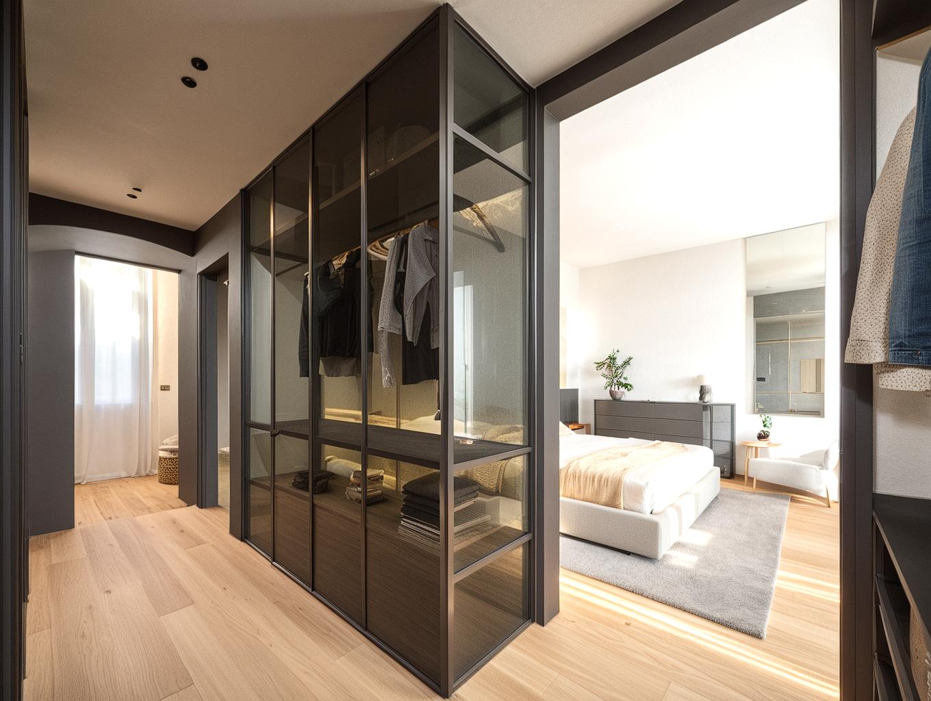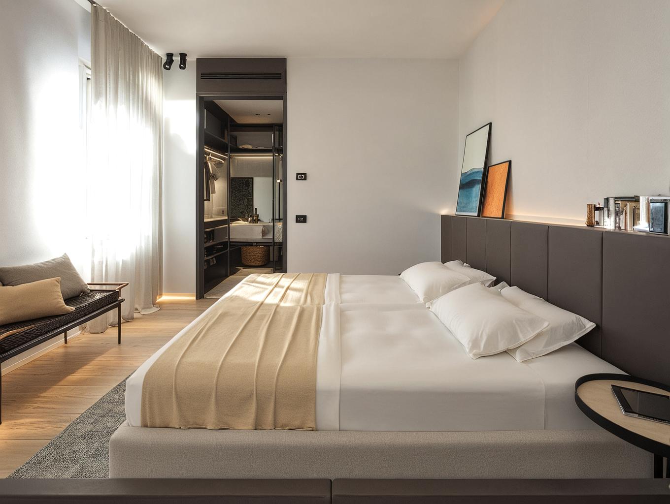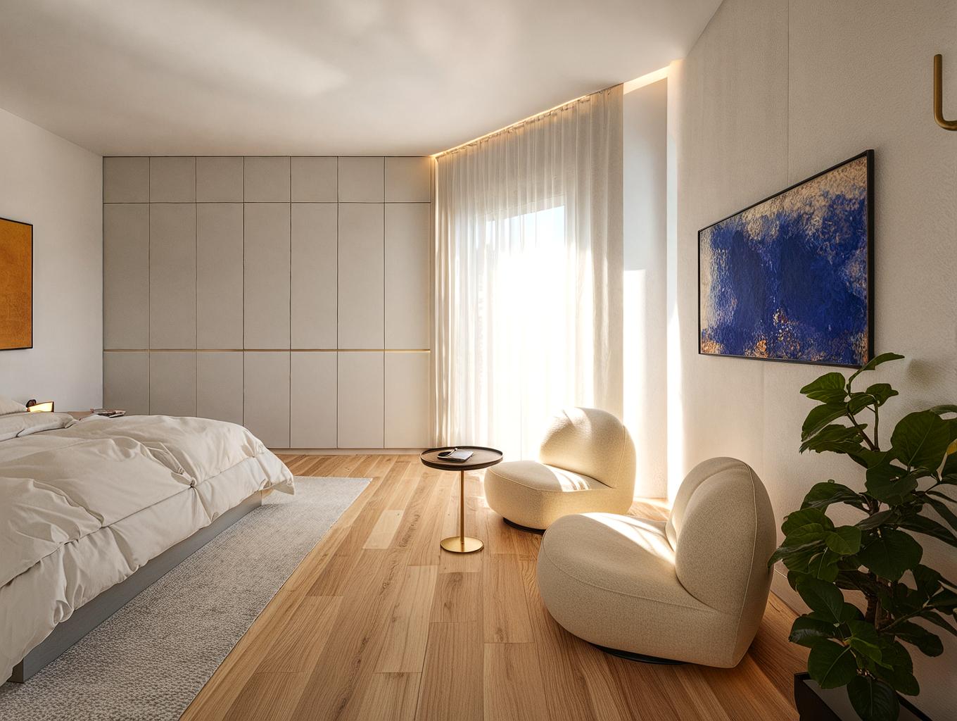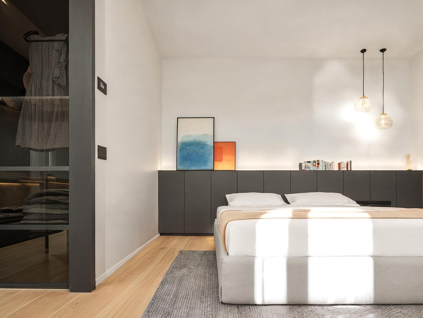 Il progetto di ristrutturazione della zona notte di questa villa è stato concepito per esaltare la luce naturale, sfruttata al massimo grazie a soluzioni architettoniche e materiali scelti con cura. Le cabine armadio su misura, eleganti e funzionali, ottimizzano gli spazi, creando ambienti organizzati e raffinati. I pavimenti in parquet nelle camere donano calore e luminosità, mentre il marmo scelto per i bagni riflette la luce in modo sofisticato, creando un'atmosfera rilassante e di classe.